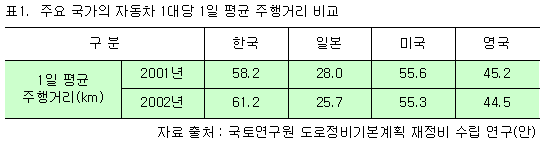 빈곤의 악순환이라는 말이 있다. 마찬가지로 우리나라 교통난은 자동차 위주 도로공급 정책이 빚어낸 악순환이다. 교통 혼잡이 발생하는 이유는 도심과 부도심을 연결하는 대중교통노선과 운행횟수가 미흡하고, 도시 내에서 자동차를 운행하는 것이 불편하지 않기 때문이다. 대중교통에 대한 투자 미비(참고자료 2참조)는 국민들이 자동차를 이용하도록 강요하고 있고, 이는 우리나라 자동차의 하루 운행거리가 다른 어떤 나라보다 높게 만드는 결과를 낳았다. 아래 표에서 보듯 우리나라 자동차 1대당 1일 운행거리가 자동차의 천국이라 불리는 미국보다는 하루 6km, 이웃 일본보다는 무려 35.5km나 더 길다. 더욱이 2001년과 2002년 자동차 운행거리를 비교하였을 때 우리나라만이 유일하게 주행거리가 증가하였다는 점도 시사하는 바가 크다.