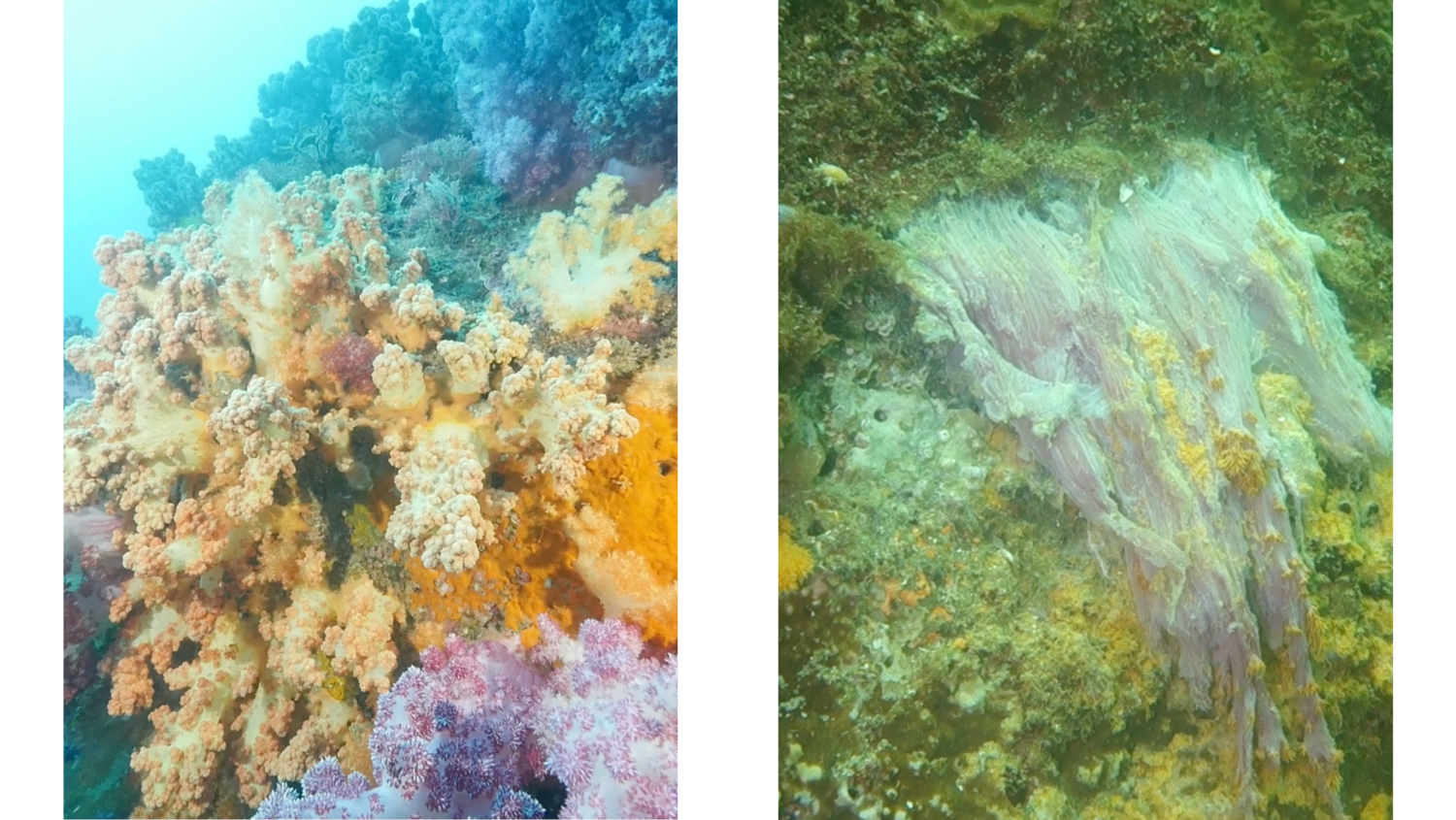 제주도 남녘의 상황은 더 심각합니다. 다양한 해양생물의 안식처를 제공하던 모자반 군락지는 해수온 상승으로 인해 사라져버리고 있습니다. 이를 갯녹음 현상이라고 합니다. 갯녹음은 현재 곳곳에서 진행 중입니다. 서귀포 인근 해저에 세계적으로 희귀한 군락지를 형성하며 화려한 자태를 뽐내던 연산호는 근 몇 년 사이 여름철 30도를 웃도는 기록적인 초고수온 현상 때문에 형체를 유지하지 못하고 녹아내리듯 죽어가고 있습니다. 녹색연합의 전문기구인 해양시민과학센터 파란의 산호탐사대에서 촬영한 연산호의 모습은 충격적입니다.