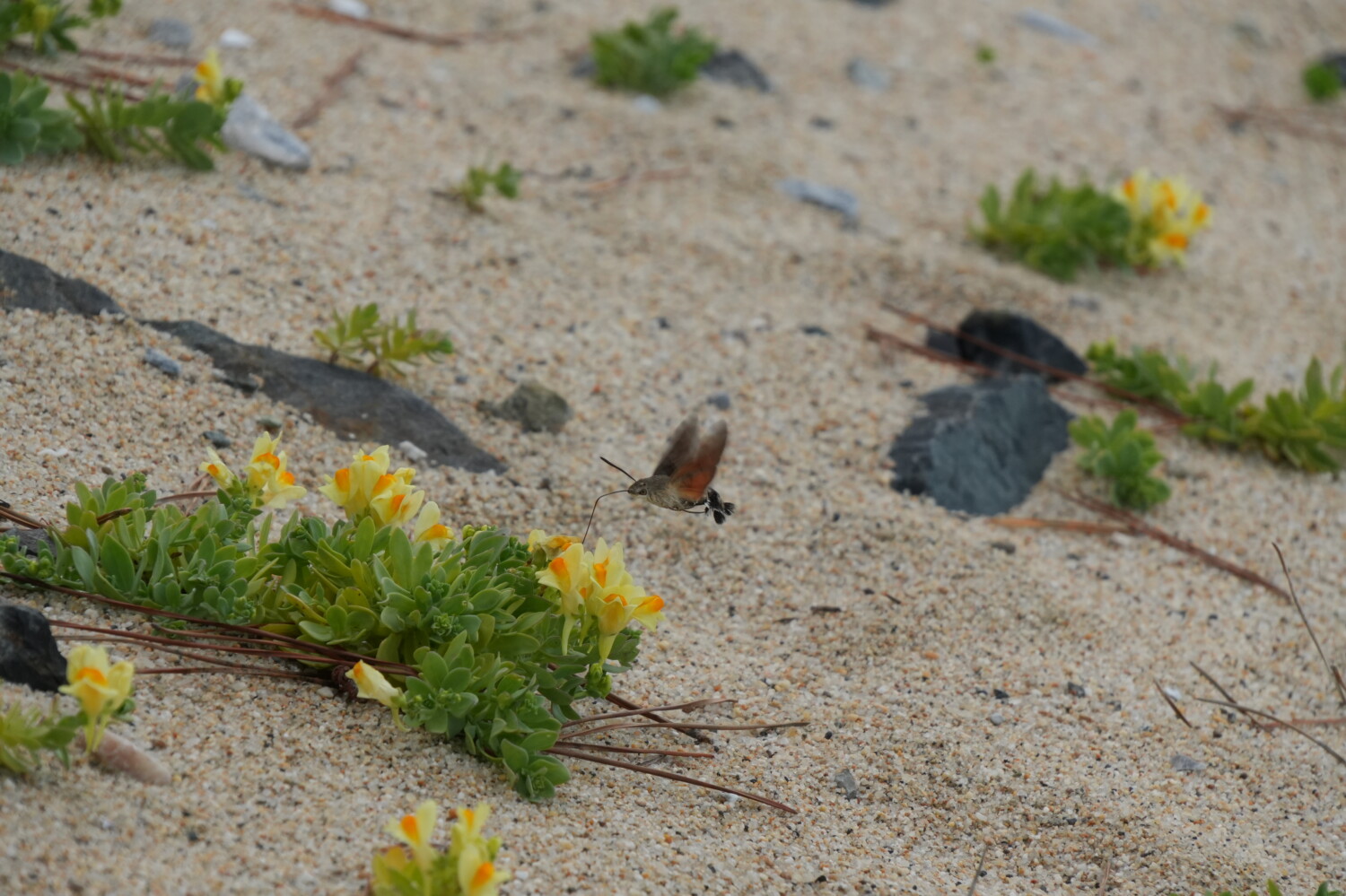 해란초가 열심히 피워낸 꽃에서 꿀을 먹는 박각시나방이 분주하게 날아다닙니다. 강릉 안인사구. ©녹색연합