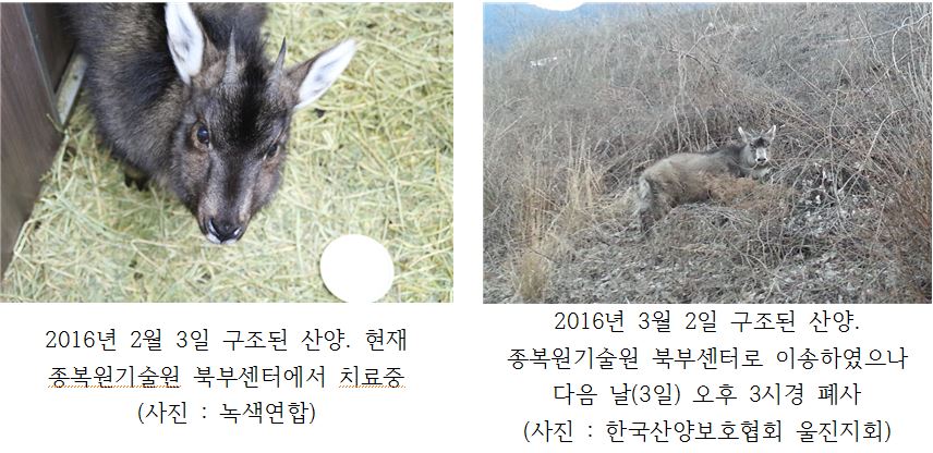 3월 2일 또 다시 경상북도 울진군 온정면에서 탈진 직전의 산양 한 개체가 구조되었다. 지난 2월 3일 울진군 두천리에서 탈진한 산양 이후 올 들어 2번째 구조이다. 오후 4시 30분 경 지역주민의 신고를 받고 지역에서 산양보호를 위해 꾸준히 활동하고 있는 (사)한국산양보호협회 울진지회와 울진군청 천연기념물과 담당 공무원이 현장으로 출동하였다. 현장 확인 후 119의 도움으로 산양을 구조하였으나 한국산양보호협회에 인계된 시간은 오후 8시 30분이었다. 하지만 문화재청 산하 한국산양보호협회에는 수의사도 없으며, 제대로 된 치료시설도 갖춰져 있지 않아 다른 기관으로 또 다시 이송되어야 했다. 결국 인계된 산양은 다시 4시간 가량을 달려 강원도 인제에 위치한 종복원기술원 북부센터에 도착해서야 치료를 받을 수 있었다. 울진 지역에서 구조된 지 6시간만의 일이다. 하지만 결국 구조된 다음 날(3월 3일) 오후 3시 5분 경 폐사하고 말았다.
