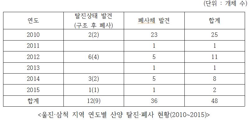 2010년부터 2015년까지 울진·삼척 지역에서 탈진·폐사한 산양은 총 48마리다. 이 중 탈진 상태로 발견된 산양은 12마리었으나, 9마리가 구조·이송·치료 도중 폐사하였다. 무려 75%에 달하는 수치이다. 이는 국가적으로 보호종으로 지정된 산양에 대한 보호·관리가 얼마나 부실하게 진행되고 있는지 단적으로 보여주는 것이다.