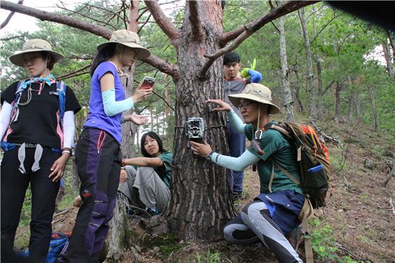 무인센서카메라를 설치하고 있는 야생동물탐사단