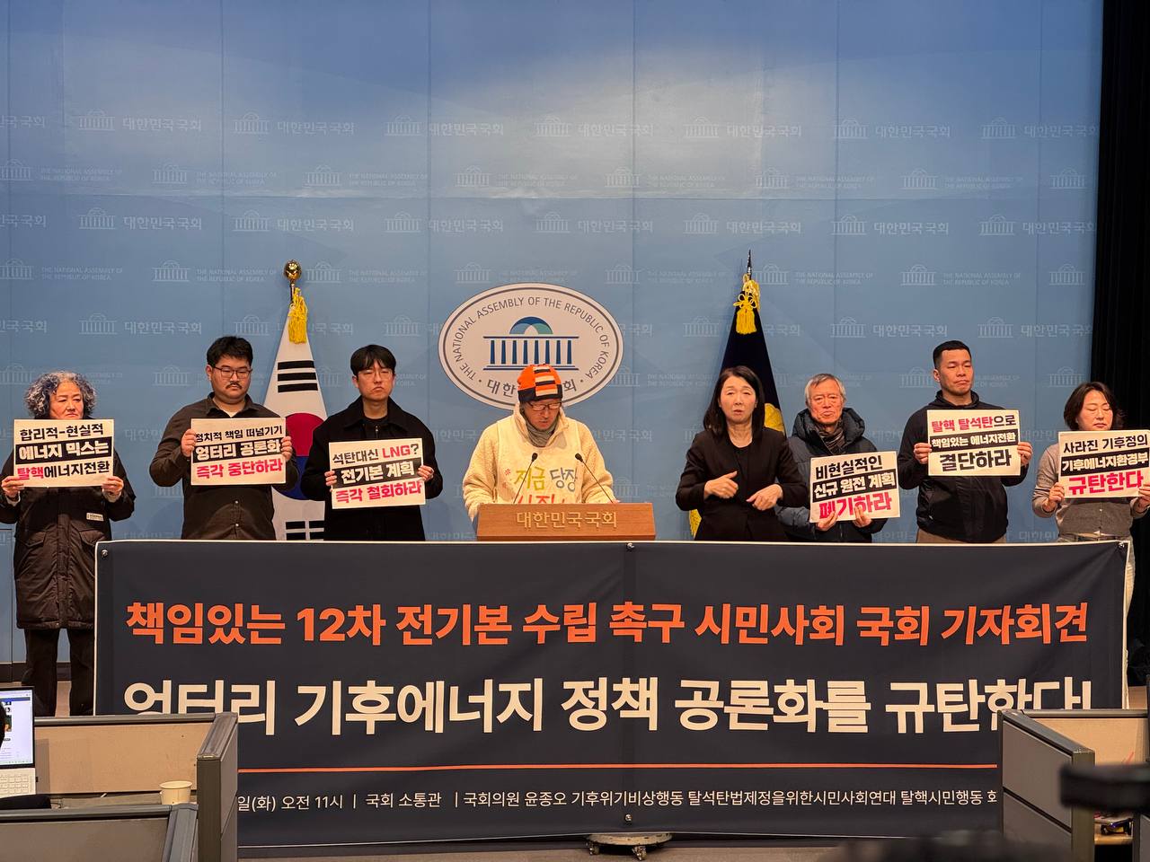 기후위기비상행동과 탈석탄법제정을위한시민사회연대, 탈핵시민행동, 화석연료를넘어서 등 전국 시민사회 연대체들은 12월 30일 오전 11시 국회 소통관에서 기자회견을 열고, 정부가 최근 추진 중인 ‘기후에너지 정책 공론화’가 정책 결정의 책임을 시민에게 떠넘기는 요식행위에 불과하다며 강력히 규탄했다. 이들은 “정부는 공론화로 포장한 몇 차례의 여론조사와 대국민 토론회 등을 비롯해 책임민주주의와 사회적 합의의 본질을 흐리는 모든 시도를 즉각 중단하라”고 강조하며 “탈핵·탈석탄·탈가스와 조속한 재생에너지 확대 등 정의로운 에너지 전환의 방향을 분명히 담은 책임있는 제12차 전력수급기본계획을 수립할 것”을 촉구했다.