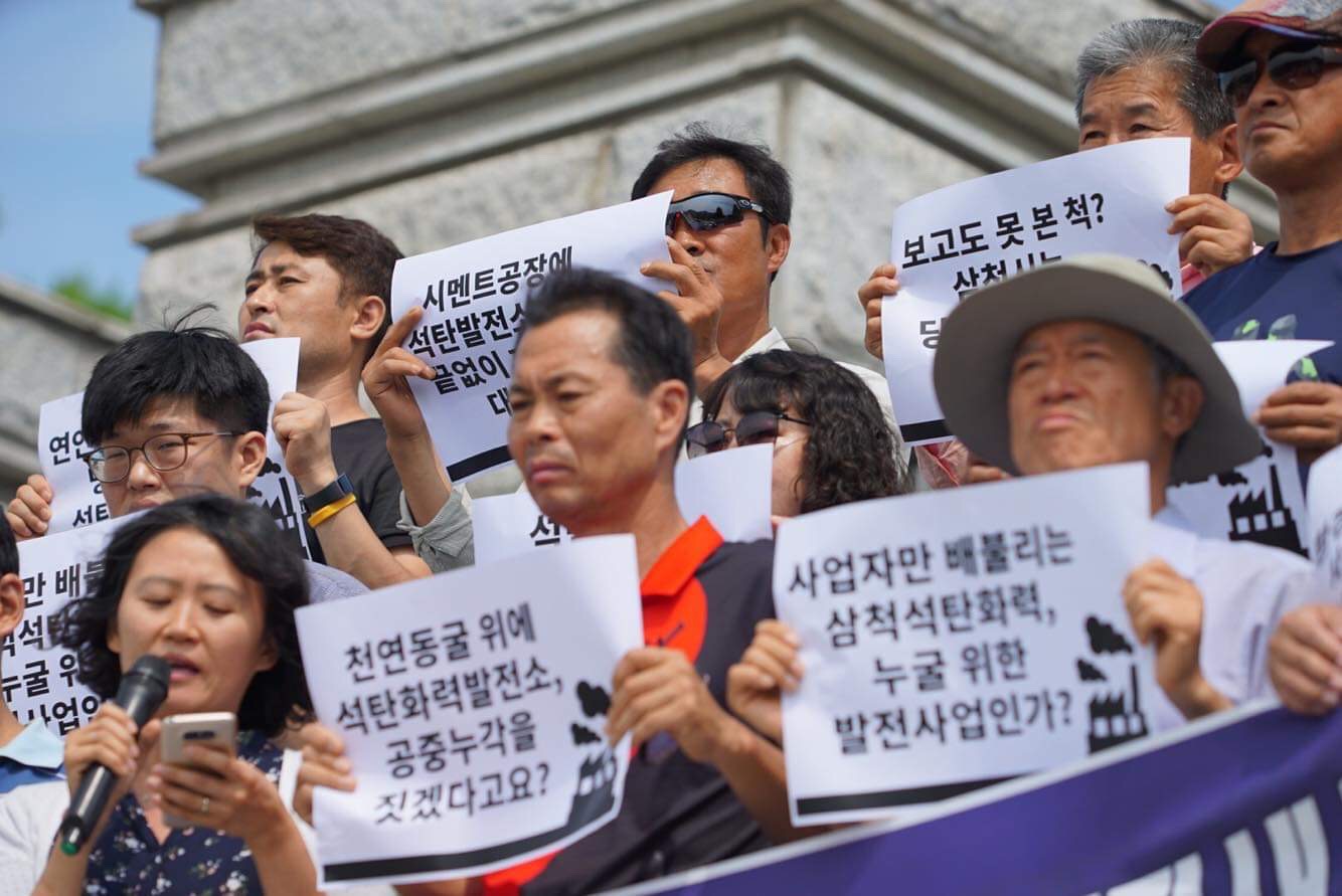 오늘 지역주민들과 강원지역 사회단체, 서울의 환경단체 등은 삼척화력발전소 공사중단을 삼척시에 촉구하기 위해 삼척시청 앞에 모였다.