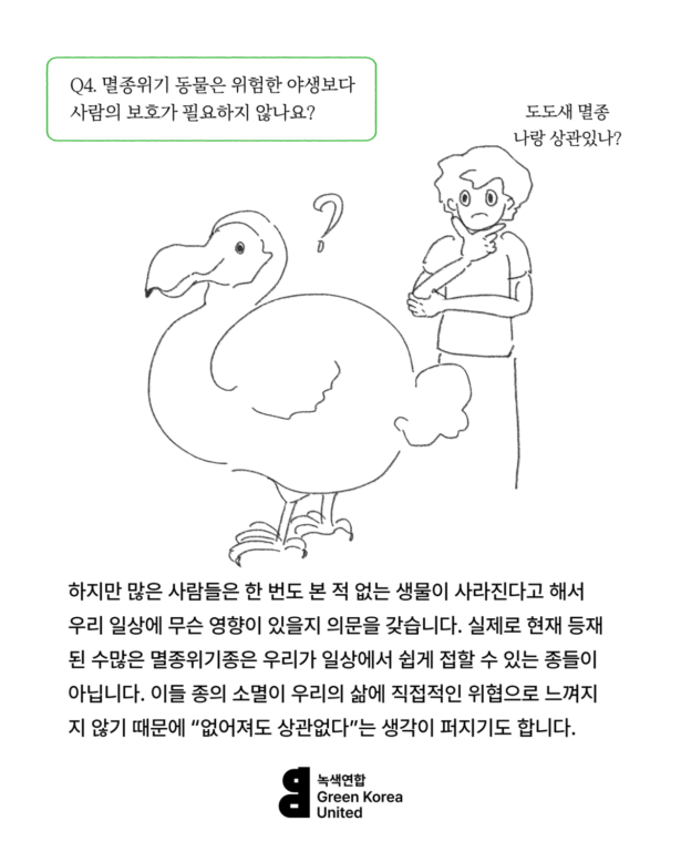 하지만 많은 사람들은 한 번도 본 적 없는 생물이 사라진다고 해서 우리 일상에 무슨 영향이 있을지 의문을 갖습니다. 실제로 현재 등재된 수많은 멸종위기종은 우리가 일상에서 쉽게 접할 수 있는 종들이 아닙니다. 그래서일까요? 이들 종의 소멸이 우리의 삶에 직접적인 위협으로 느껴지지 않기 때문에 “없어져도 상관없다”는 생각이 퍼지기도 합니다.