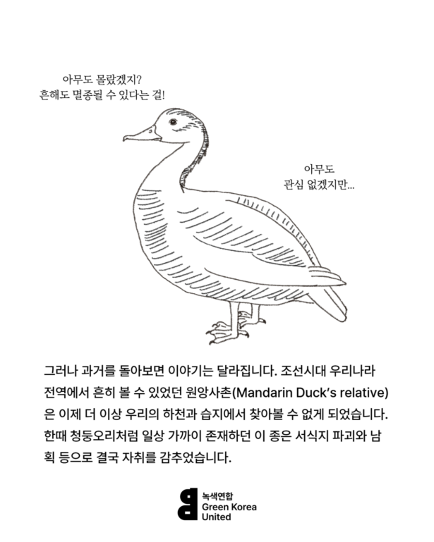 그러나 과거를 돌아보면 이야기는 달라집니다. 조선시대 우리나라 전역에서 흔히 볼 수 있었던 원앙사촌(Mandarin Duck’s relative)은 이제 더 이상 우리의 하천과 습지에서 찾아볼 수 없게 되었습니다. 한때 청둥오리처럼 일상 가까이 존재하던 이 종은 서식지 파괴와 남획 등으로 결국 자취를 감추었습니다. 이 사례는 특별한 몇몇 종만이 멸종위기종이 되는 것이 아니라, 현재 우리 주변에서 흔히 볼 수 있는 생물들 역시 환경 변화와 인간 활동에 따라 언제든지 멸종위기종이 될 수 있음을 보여줍니다.