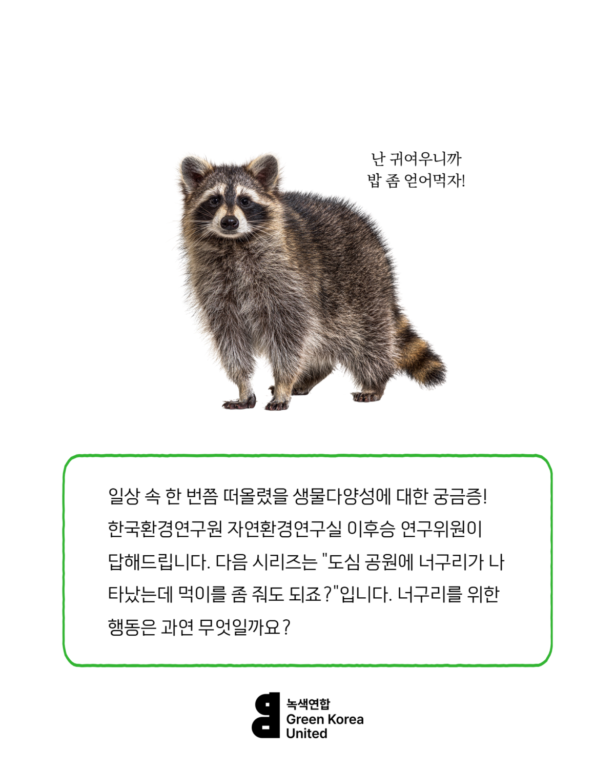 한국환경연구원 자연환경연구실 이후승 연구위원이 답해드립니다. 다음 질문은 “도심 공원에 너구리가 나타났는데 먹이 줘도 되죠?”입니다.