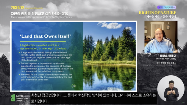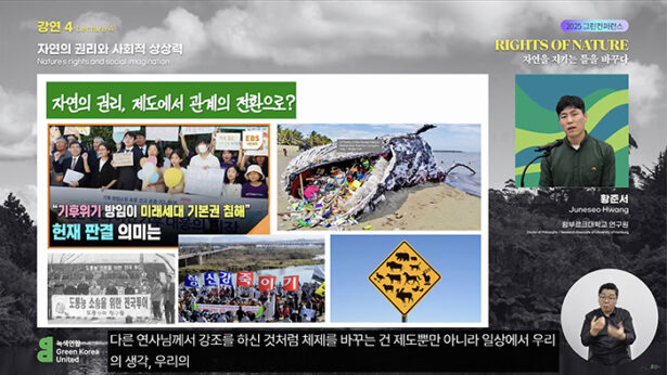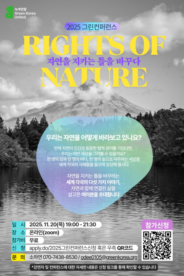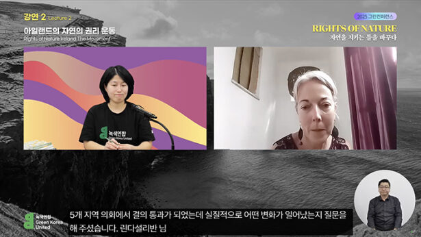녹색연합은 11월 20일(목) 오후 7시 온라인 ZOOM에서 해외의 다양한 자연의 권리 사례를 소개하고, 한국의 자연의 권리 사례를 짚어보고 상상하는 내용으로 2025 그린컨퍼런스 「Rights of Nature : 자연을 지키는 틀을 바꾸다」를 개최했다. 녹색연합 대표 대중강연 행사인 그린컨퍼런스는 ‘자연의 권리’ 주제로 사회공헌(CSR)관련 이벤트 기획사인 ‘솔깃 커뮤니케이션즈’와 3년간 진행해 왔다. 올해는 자연의 권리를 주제로 강연하는 마지막 프로그램으로. 미국, 아일랜드, 에콰도르 등 해외의 자연의 권리 운동 사례와 한국의 생태법인 1호, 제주 남방큰돌고래 사례를 소개하였다. 녹색연합은 영한통역, 수어통역, 문자통역을 진행하여 강연 접근성을 높이고 강연에 참여한 다양한 256명의 시민들과 세계 각국의 다섯 가지 이야기를 통해 자연의 권리를 어떻게 바라보고 상상해야 하는지 함께 고민해 보는 자리를 가졌다.