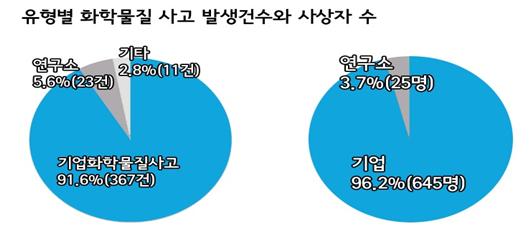 화학물질 사고 발생 주체에 따라 분류해보면, 지난 13년간 총 401건의 화학물질 사고 중 367건이 기업의 사업장에서 발생하여 전체 사고 중 91.6%를 차지하고 있는 것으로 확인되었으며, 기업을 제외한 사고는 대학 실험실과 같은 연구소, 가정집 등 34건으로 8.4%를 차지하였다. 연구소 사고는 대학교 실험실을 포함한 국가연구소, 고등학교 등에서는 주로 작업자 부주의로 인한 용기 파손, 이상 반응으로 인한 폭발 등이 주를 이뤘고 총 23건 의 화학 사고로 25명의 부상자가 발생하였다. 기타 사고로는 가정집, 농가, 고물상, 병원 등에서 발생하여고 고의로 인한 화학물질 탱크 훼손 1건을 포함, 총 11건이 발생하였다.
