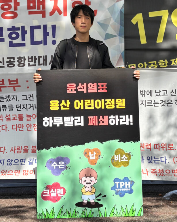 이날 대통령실 앞에서 1인 시위에 참여한 녹색연합 박상욱 활동가는 “과거 당론을 주도하며 용산 어린이정원 문제를 비판했던 이재명 대통령이 이제 윤석열표 오염 정원 폐쇄를 결단해야 할 때”라고 강조했다.