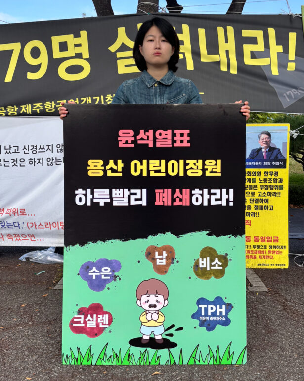 오늘(10월 23일) 녹색연합·용산시민회의·정치하는엄마들·대학생 연합 환경동아리 푸름은 대통령실 앞에서 ‘윤석열표 용산 어린이정원 폐쇄’ 요구 릴레이 1인 시위에 돌입했다. 참여 단체들은 윤석열 정부 시절 제대로 된 오염 정화를 거치지 않고, 미군 반환 부지에 졸속으로 조성된 용산 어린이정원이 이재명 정부에서도 그대로 개방 되고 있는 문제를 지적하며, 이재명 정부의 책임있는 결단을 촉구했다. 이재명 대통령은 더불어민주당 대표로 있던 시절, 윤석열 정부 임기 내내 오염문제, 예산 삭감 등 당론을 주도해왔는데, 권력을 잡은 지금 오염 정원 문제 해결에 미온적이라는 것이다.