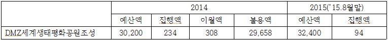 DMZ세계생태평화공원의 경우 2014년 예산액은 302억 원으로 책정되었으나 이 중 3억 800만 원 이월, 296억 5,800만 원이 불용되고 단 2억 3,400만 원만 집행되어 집행률이 0.8%에 불과하다. 2015년의 경우 2014년보다 예산을 증액하여 324억 원을 책정하였으나, 2015년 8월까지 집행된 예산은 단 9,400만 원에 불과하고 기본 연구개발비를 제외한 토지매입비, 설계비, 시설비 등은 2015년 하반기에도 집행될 가능성이 없어 결국 2015년 예산 집행률은 0.3%에도 못 미칠 것으로 예상된다. 이처럼 사업 집행이 전혀 안 되고 있음에도 불구하고 정부는 또 다시 2016년 예산으로 324억 원을 편성하였다.
