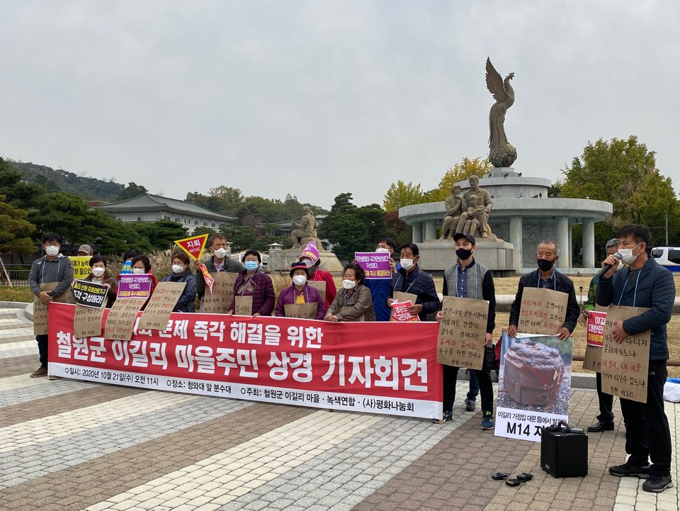 오늘 11시 철원군 이길리 마을 주민, 녹색연합, (사)평화나눔회 회원 약 30여명은 청와대 앞에서 공동으로 기자회견을 열였다.
