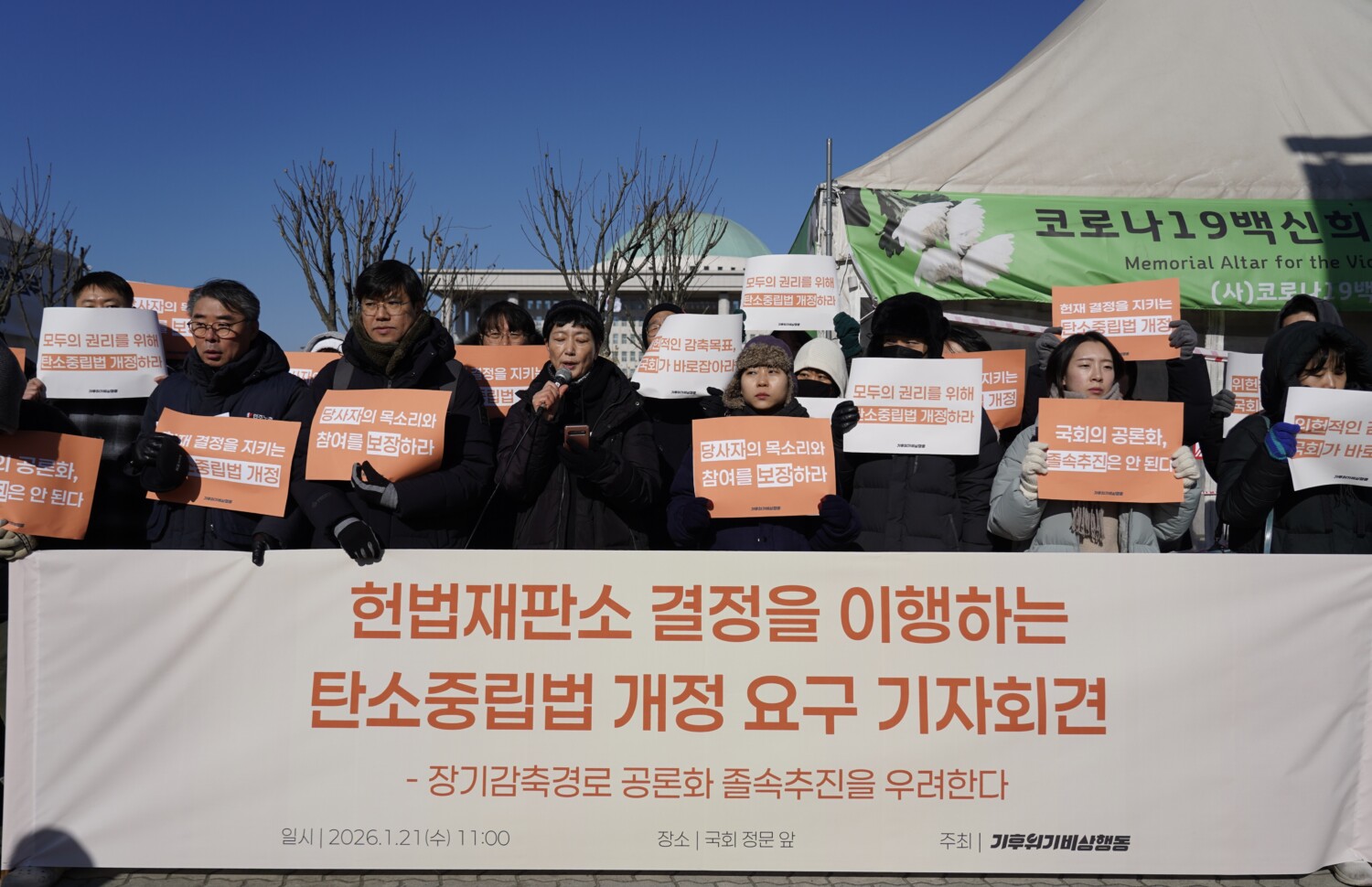 기후위기비상행동은 21일(수) 오전 11시 국회 정문 앞에서 <헌법재판소 결정을 이행하는 탄소중립법 개정 요구 기자회견>을 열고, 국회가 추진 예정인 장기감축경로(2031~2049) 공론화가 단기간에 형식적으로 진행될 우려가 커 헌법재판소 결정 취지를 충족하기 어렵다며, 공론화 설계 단계부터 헌재 기준에 부합하는 원칙을 선행적으로 마련할 것을 요구했다.