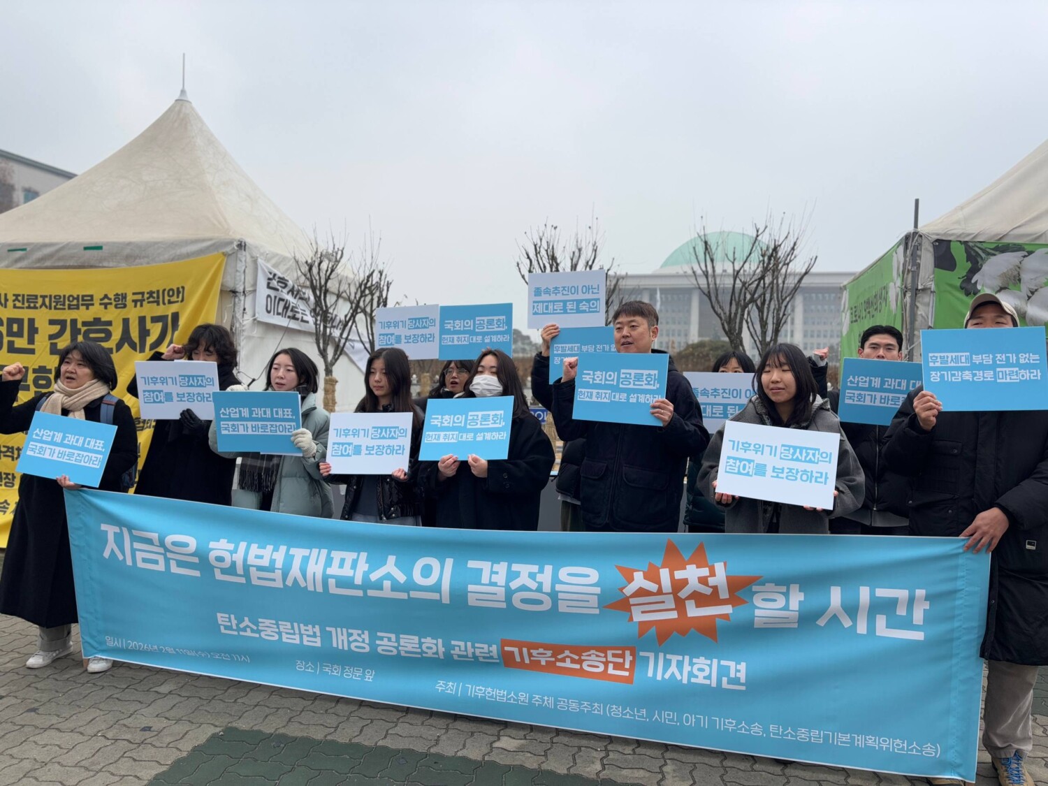 청소년·시민·아기 기후소송단과 대리인단은 오늘(11일) 오전 11시 국회 정문 앞에서 기자회견을 열고, 국회 공론화가 졸속으로 진행될 우려가 크고, 헌재 결정의 취지를 충분히 반영하기 어렵다며 의제 설정, 참여 구성, 자료 검증, 숙의 기간 및 운영 원칙을 헌재 결정에 맞게 다시 설계해야 한다고 주장했다.