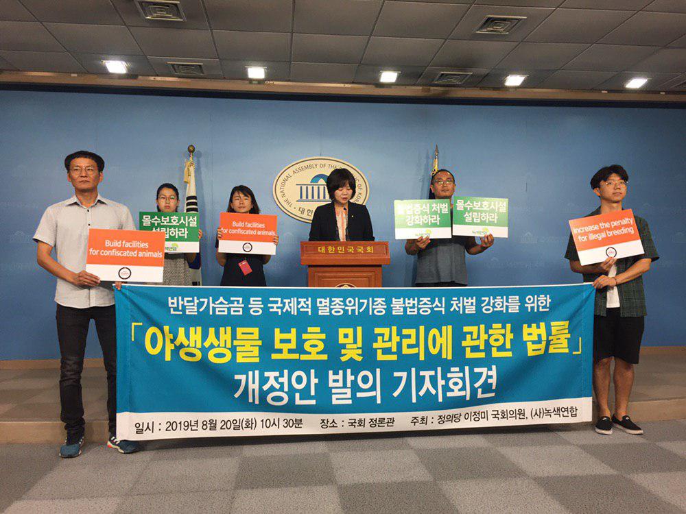 정의당 이정미 국회의원과 녹색연합은 반달가슴곰 등 국제적 멸종위기종 불법증식 처벌 강화를 위한 「야생생물 보호 및 관리에 관한 법률」 개정안 발의 기자회견을 오늘(20일) 10시 30분 국회정론관에서 진행했다. 국제적 반달가슴곰 불법증식에 대한 처벌 강화와 32마리의 불법증식 개체에 대한 국가의 보호와 관리를 촉구했다.