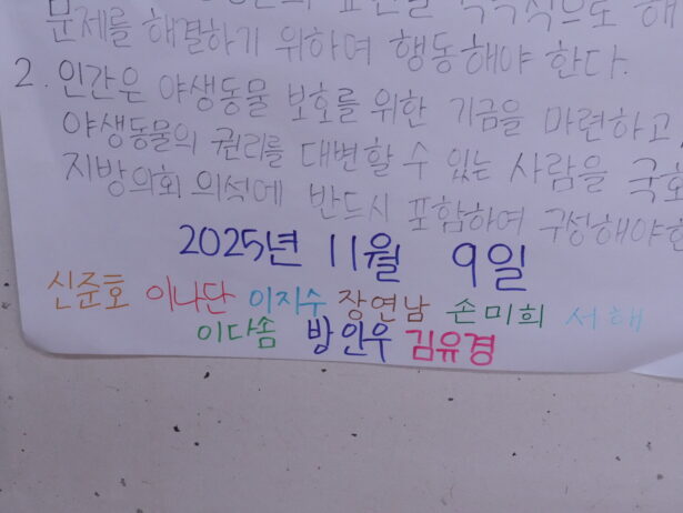그러나 기후위기와, 개발, 인간의 편의를 우선하는 선택들로 인해 울진의 건강한 생태계가 위협받고 있다. 우리 야생동물탐사단 15기는 울진에서 만난 생명들의 권리와 그들이 사는 울진이라는 야생의 권리를 존중하며, 다음과 같이 선언한다.