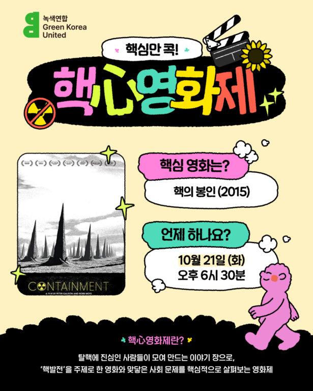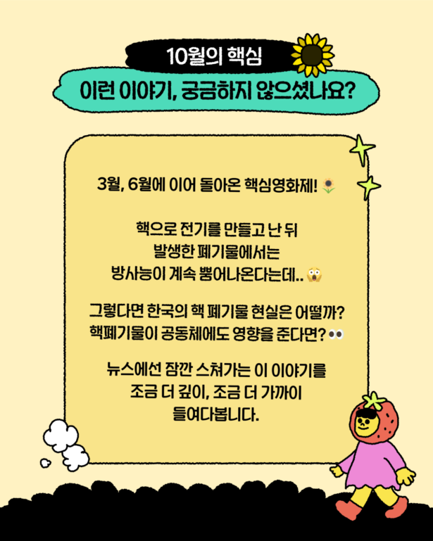 탈핵에 진심인 사람들이 모여 만드는 이야기 장으로, ‘핵발전’을 주제로 한 영화와 맞닿은 사회 문제를 핵심적으로 살펴봅니다. 10월의 주제는 핵발전과 공동체입니다.