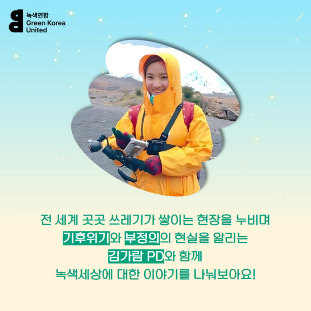 전 세계 곳곳 쓰레기가 쌓이는 현장을 누비며 기후위기와 부정의의 현실을 알리는 김가람 PD와 함께 녹색세상에 대한 이야기를 나눠보아요🙌