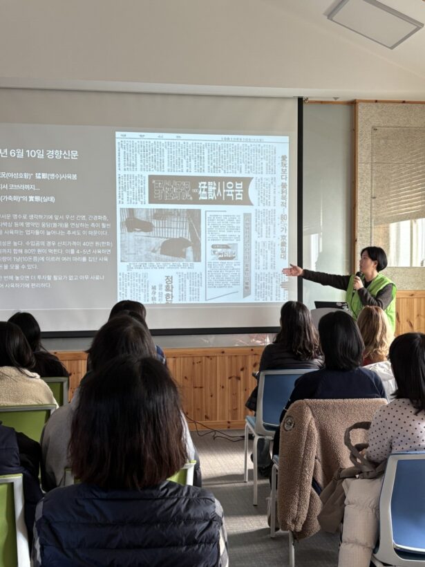 사육곰 산업의 역사와 사육곰 구출, 정책의 변화 등을 강연하는 서해 활동가