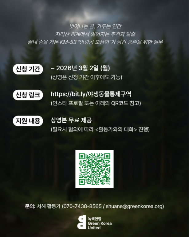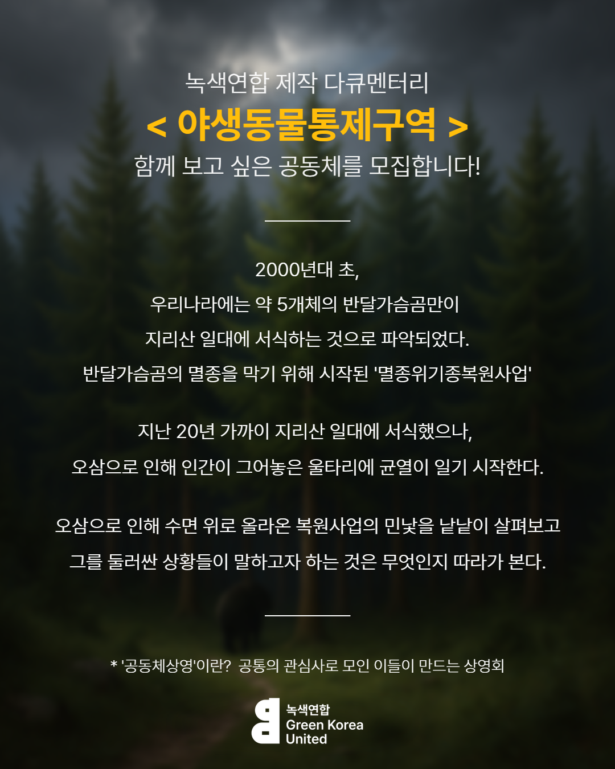 녹색연합이 제작한 다큐멘터리 <야생동물통제구역>을 함께 보고 이야기 나눌 공동체를 찾습니다!👀🐻