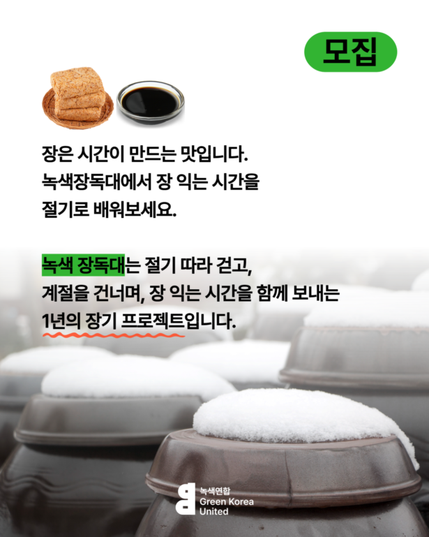 녹색 장독대는 장 담그기를 하나의 체험이 아니라, 절기의 흐름 속에서 시간을 함께 보내는 연속형 시민모임으로 기획되었습니다.