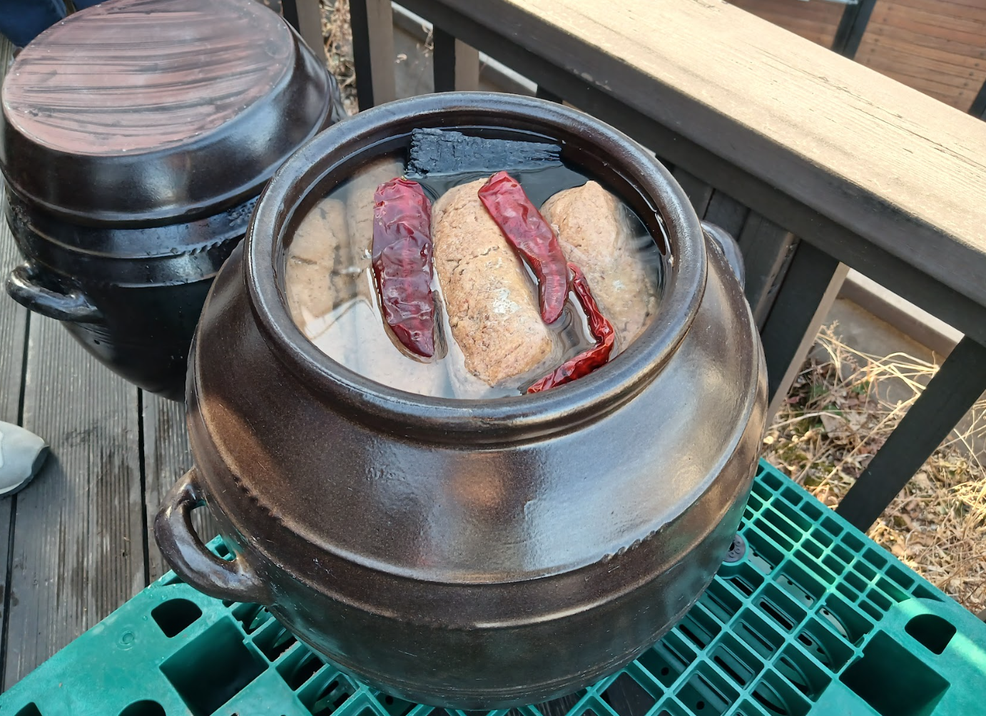 성곽길에서 봄의 기운을 느끼고 내려온 우리는 사무실 앞마당에 모였습니다. 그리고 빈 항아리를 열고 장을 담그기 시작했습니다. 다음 절기를 함께 맞이하기로 약속한 셈이죠. 겨울 초입, 김장을 마친 뒤 우리의 선조들은 메주를 빚었습니다. 그리고 콩을 삶아 찧어 벽돌 모양으로 빚고, 볏짚으로 묶어 따뜻한 곳에 매달았지요. 초기에는 곰팡이가 자리 잡을 수 있도록 온기를 주고, 이후 차가워지는 날씨는 잡균을 줄여 발효가 안정적으로 이어지게 합니다. 그렇게 90일에서 100일 동안 메주는 겨울을 통과합니다. 차가운 공기는 발효를 서두르지 않게 하고, 콩은 조급하지 않게 시간을 견딥니다. 그리고 정월 무렵, 입춘이 지나 기온이 서서히 오르기 시작하면 우리는 장을 담급니다. 깨끗이 씻은 항아리에 소금물을 붓고 메주를 넣습니다. 숯과 고추를 올린 뒤 항아리는 햇볕과 바람 속에 놓입니다. 항아리는 그 순간 또 하나의 생태계가 됩니다. 수천 종의 미생물이 콩 단백질을 분해하고 구수한 향을 만들어내지요. 눈에 보이지 않지만 그 안은 복잡한 변화가 쉼 없이 이어집니다. 봄이 되어 나무가 수액을 밀어 올리듯 장도 그렇게 깨어납니다. 물이 오르는 절기에 장을 담그는 이유도 아마 그 흐름을 따르기 때문일 것입니다.
