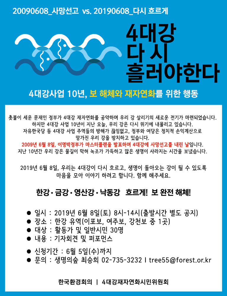 2019년 6월 8일, 우리는 4대강이 다시 흐르고, 생명이 돌아오는 강이 될 수 있도록 마음을 모아 이야기 하려고 합니다. 함께 해주세요.
